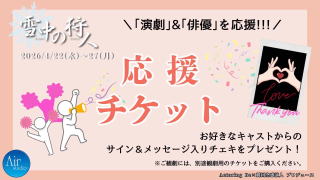 | チケット料金 | ■来場観劇チケット ◆VIP最前席 7,000円 (最前列指定席、特典付※) ◆前方席 6,000円 (前方中央指定席、特典付※) ※VIP最前席・前方席特典:印字サイン入り非売品ブロマイド ◆自由席 4,500円 (全席自由) [◆先行予約◆] 2月17日(火)22:00〜2月24日(火)23:59 (銀行振込/一度ご購入いただいたチケットは、公演中止以外での払い戻しは致しかねます。予めご了承ください。) [◇一般予約◇] 2月25日(水)22:00〜4月26日(日)23:59 ■ACTぴっと チケット予約はこちら⇒TICKET ※当日券は当日受付でのお支払い(現金のみ扱い) 注:キャンセルの場合、キャンセル料が発生することがあります。 ■配信視聴チケット 2/25(水)22:00よりチケット販売開始