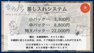 | お客様へ | ・キャストは変更になる場合がございます。ご了承ください。 ・演出の都合上、スモークマシーンを使用する場合がございます。予めご了承ください。 ・未就学生の御入場は、お断りさせて頂いております。予め、御了承頂きます様、お願い致します。 |